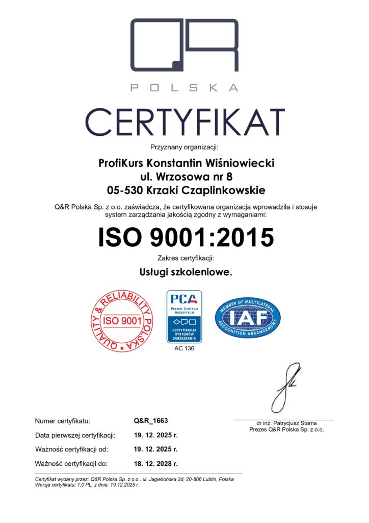 Nasza działalność realizowana jest w oparciu o System Zarządzania Jakością zgodny z normą ISO 9001:2015, co zapewnia wysoką jakość szkoleń, procesów rekrutacyjnych oraz obsługi klientów biznesowych i indywidualnych.